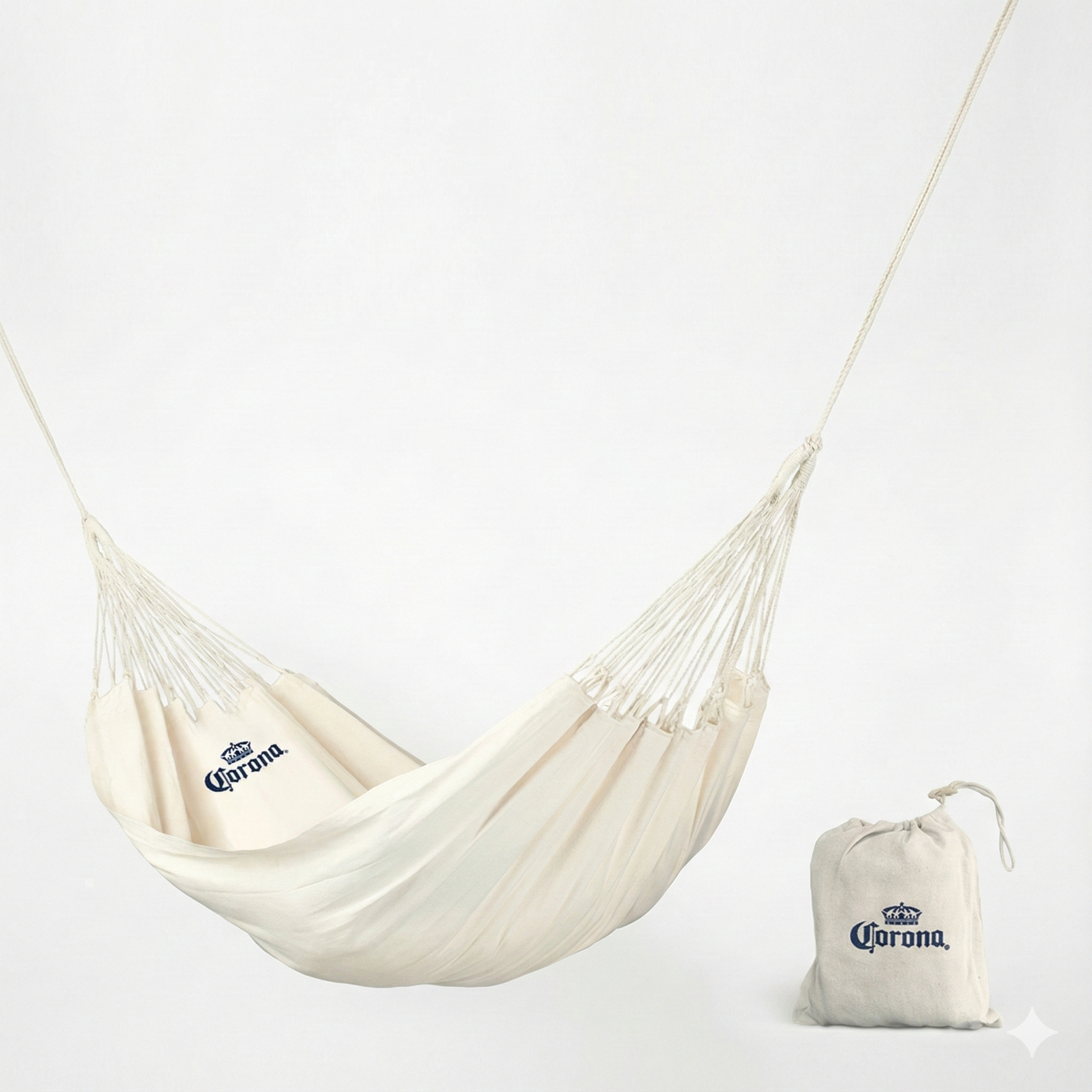 Lleva la sensación de vacaciones a tu patio, terraza o camping con esta exclusiva Hamaca Corona. Confeccionada en tela resistente de color crudo, evoca la frescura y el estilo relajado de la playa.